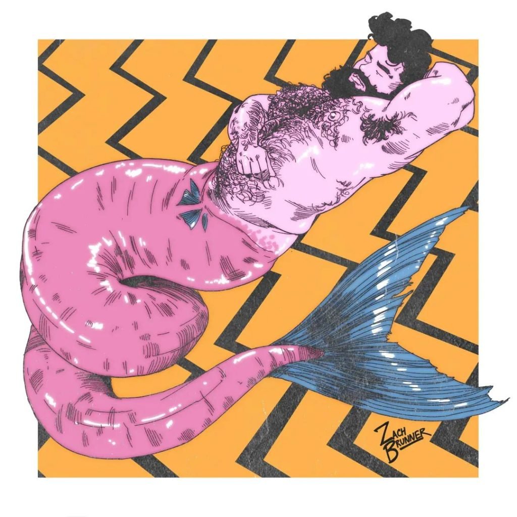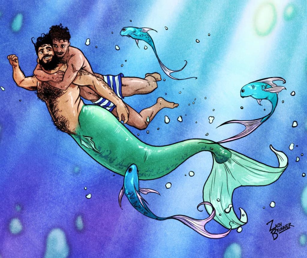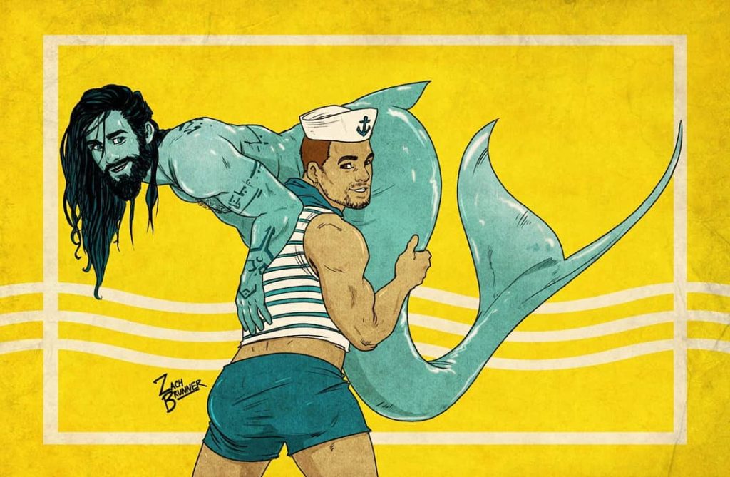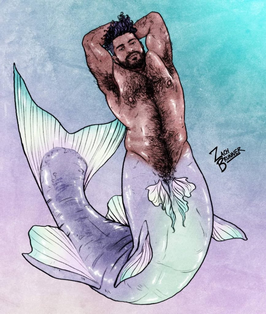 Dernier point, mais non le moindre, il y a Zach Brunner. L’artiste basé à Los Angeles est célèbre pour sa série gay homelife, ainsi que pour son penchant pour les mégots et les monstres. Toutes ces choses, et plus encore, se réunissent lorsqu’il crée ses pièces de triton. Heureusement pour nous, il semble aimer les tritons homosexuels autant que nous.