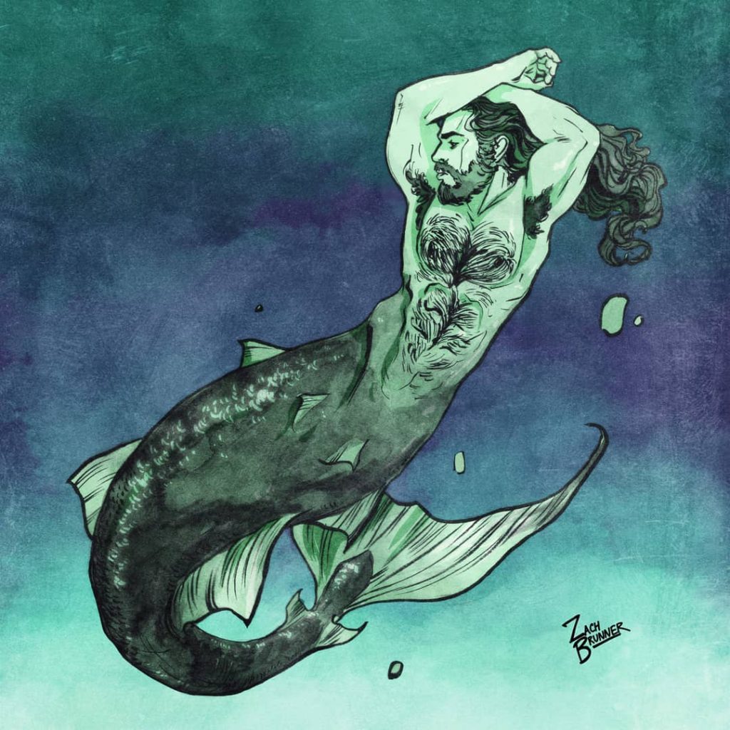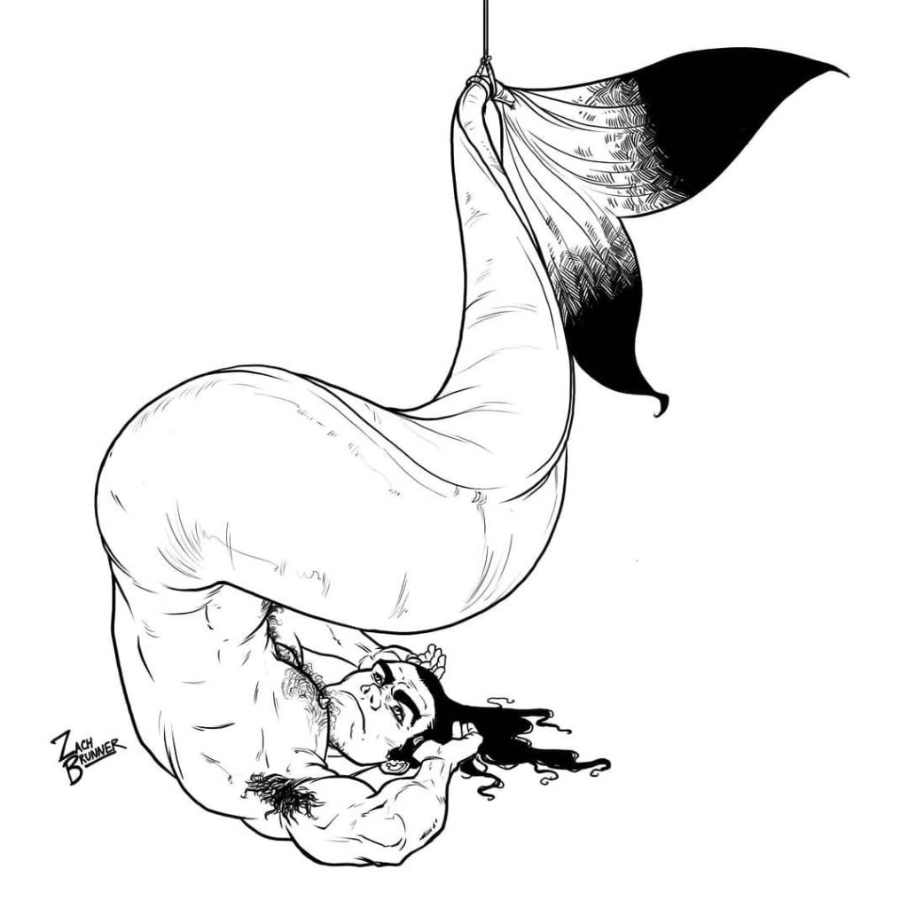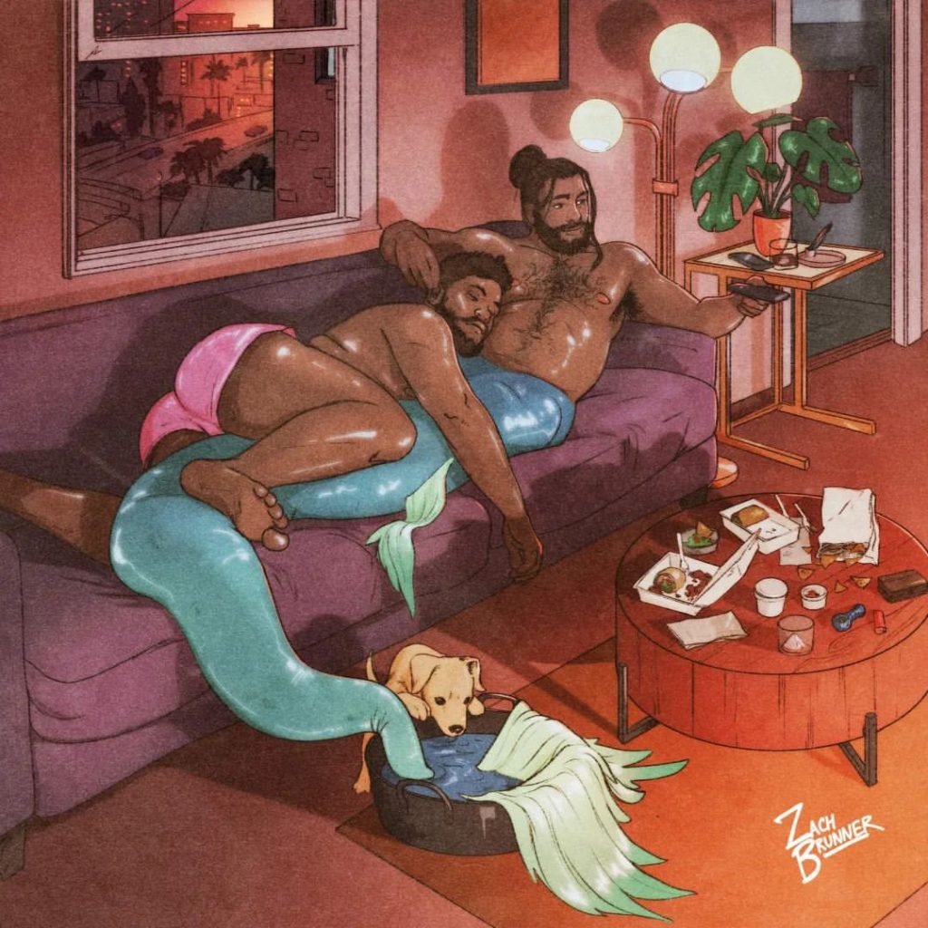 Dernier point, mais non le moindre, il y a Zach Brunner. L’artiste basé à Los Angeles est célèbre pour sa série gay homelife, ainsi que pour son penchant pour les mégots et les monstres. Toutes ces choses, et plus encore, se réunissent lorsqu’il crée ses pièces de triton. Heureusement pour nous, il semble aimer les tritons homosexuels autant que nous.