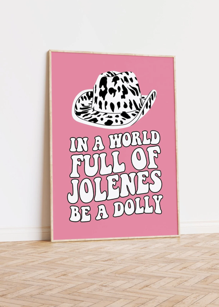 Pour commencer la liste, nous avons cet imprimé « In a world full of Jolenes be a Dolly », faisant référence à son morceau emblématique « Jolene » qui a été récemment repris par Beyoncé. Dans l'original, nous entendons Dolly plaider : « s'il vous plaît, ne prenez pas mon homme », mais dans le Cowboy Carter version, Bey est un petit un peu plus direct, en chantant : « Je te préviens, ne viens pas pour mon homme ». Quoi qu'il en soit, ne sois pas une Jolene, d'accord ? Vous pouvez acheter ce mantra et l’imprimer sur Etsy ici.