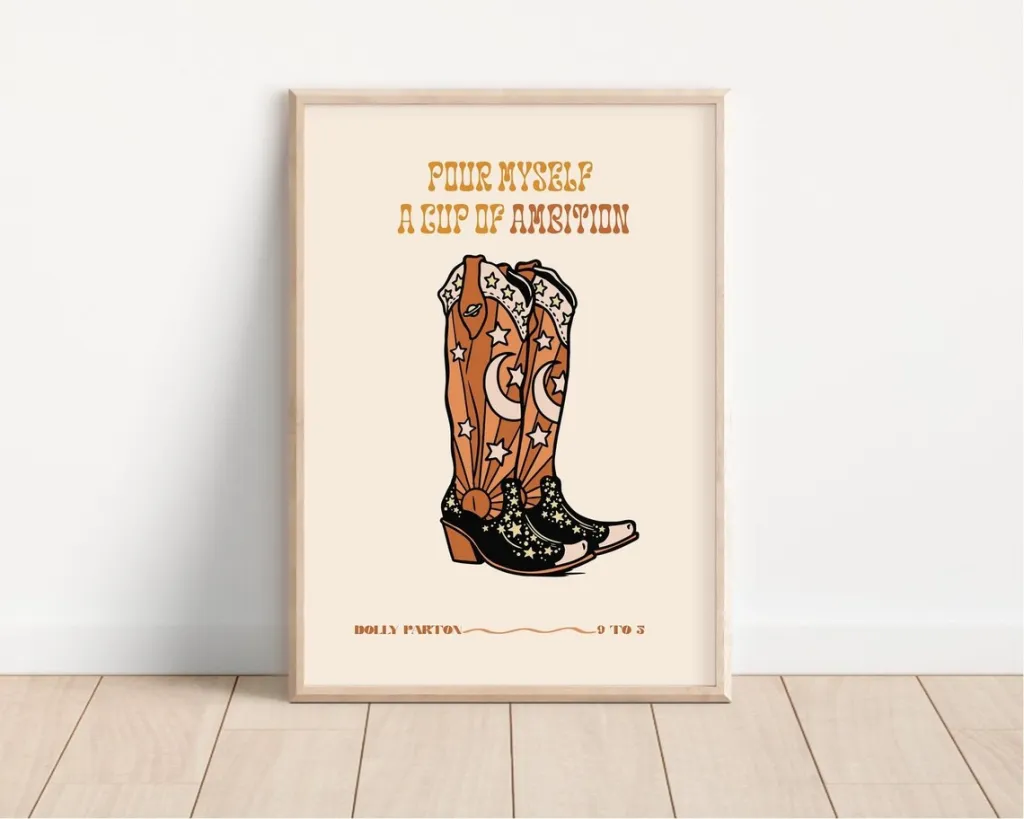 Cette impression est inspirée du plus grand succès de Dolly « 9 to 5 ». Le morceau emblématique est aussi un film et une comédie musicale, prouvant une fois de plus la puissance de Dolly. L'imprimé comporte les lignes « versez-moi une tasse d'ambition » à côté de jolies bottes de cowboy, et constitue une excellente façon de commencer la journée lorsque vous préparez votre thé ou votre café. Il est disponible sur Etsy ici.