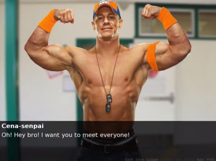 L’aventure sexy de John Cena au lycée était une courte parodie de romans visuels impliquant John Cena créée en 2014 pour son « John Cena Jam » sur itch.io. L’excitant jeu de simulation de rencontres/RPG s’est déroulé dans un lycée, où tous les personnages avec lesquels vous sortez sont John Cena. La parodie à but non lucratif créée par Will et Migoy contient sept fins. L’intrigue voit Fucco-san tenter de devenir l’un des enfants les plus populaires de sa nouvelle école après avoir été victime d’intimidation. Avant le bal, il court contre la montre et demande l’aide du seul et unique John Cena. C’est très, très idiot.