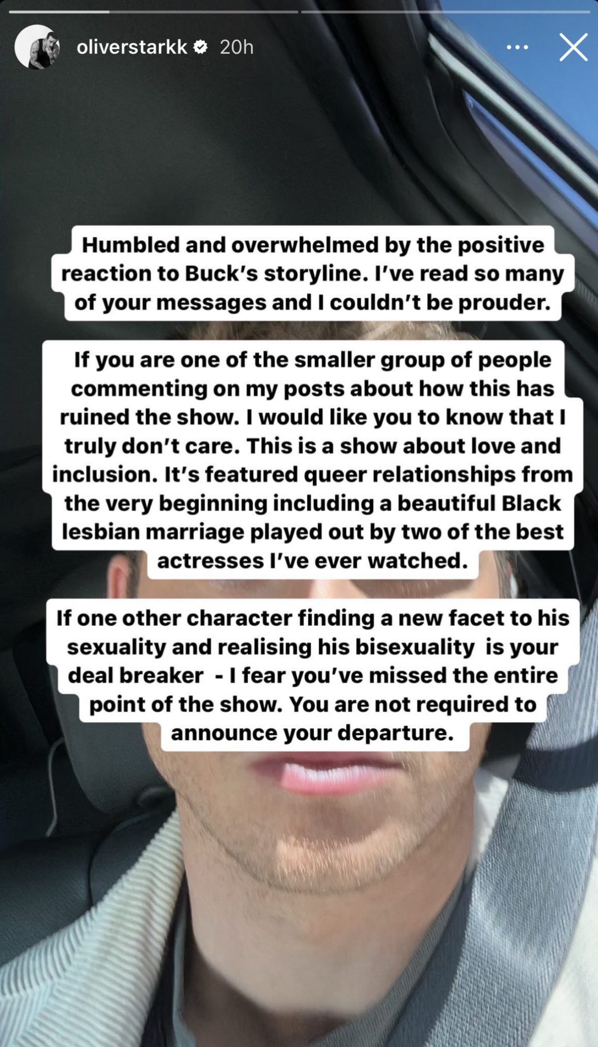 Suite à la révélation de la sexualité de Buck dans l'épisode de la semaine dernière, Stark a mis fin à la rhétorique biphobe d'un groupe sélectionné de soi-disant « fans » qui avaient pris note de ses commentaires sur les réseaux sociaux.