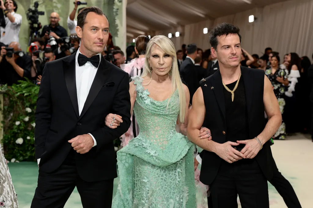 Pendant ce temps, Versace a séduit avec un vert écume de mer avec des détails de corset désossé et une traîne de plumes. Law avait l'air typiquement élégant dans un smoking noir et un nœud papillon assorti.