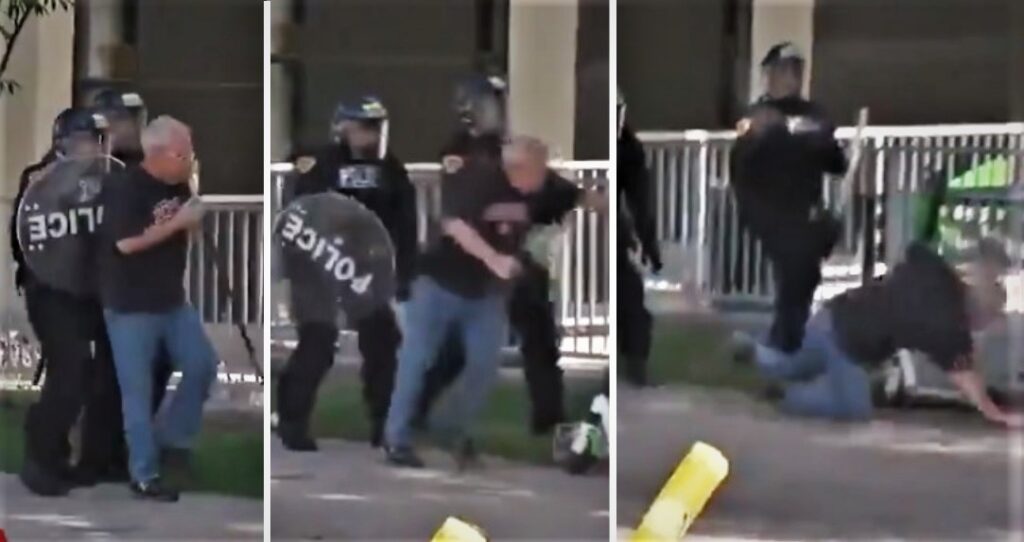Un homme âgé assistant aux manifestations pacifiques contre la brutalité policière samedi a été jeté au sol par des policiers…