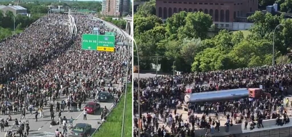 Un camion-citerne a été aperçu en train de traverser une foule de milliers de manifestants pacifiques marchant sur le pont…
