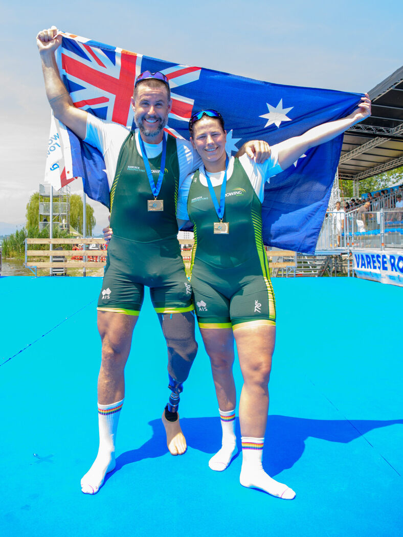 Jed Altschwager et Nikki Ayers – portant des chaussettes arc-en-ciel Pride – célèbrent leur victoire à la Coupe du monde d'aviron à Varese, en Italie, en juin 2023 | Photo gracieuseté de Nikki Ayers