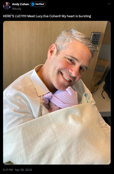 L'imprésario de télé-réalité Andy Cohen a deux enfants, Ben et Lucy. Il a dit qu'il aidait à élever ses enfants avec une communauté de pères homosexuels comme Anderson Cooper. Mais il plaisante aussi en disant que son expérience avec le De vraies femmes au foyer lui a beaucoup appris sur la façon de s'occuper des tout-petits.