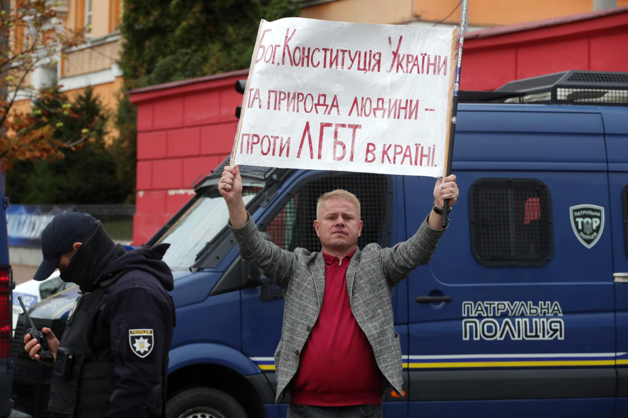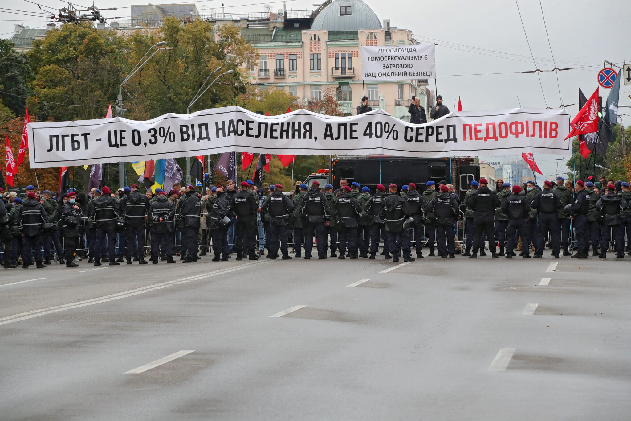 Plusieurs homophobes tenaient une immense banderole portant les mots « Les LGBT représentent 0,3 % de la population, mais 40 % des pédophiles», un récit courant en Ukraine où l’homophobie est répandue.