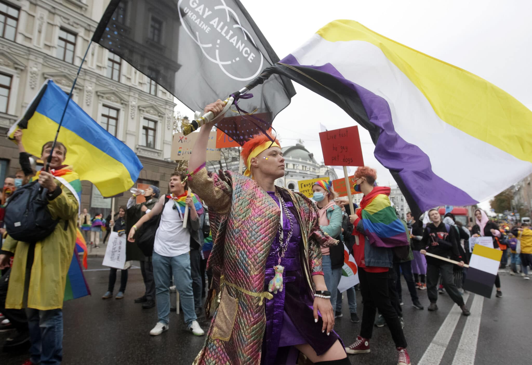 « [We] sont ici à la Fierté pour soutenir la communauté LGBTQ en Ukraine », a déclaré à AP une marcheuse, Kateryna Lytvynenko. « Nous sommes ici pour promouvoir les droits humains parce que les droits LGBTQ sont des droits humains et, malheureusement, la communauté est encore confrontée à beaucoup de violence et de discrimination en Ukraine. »