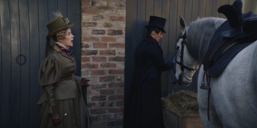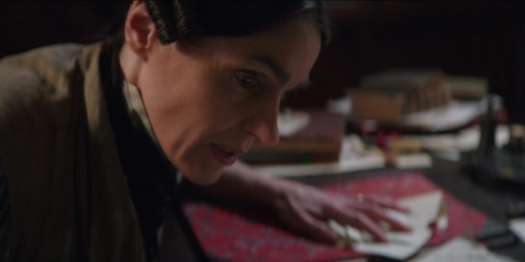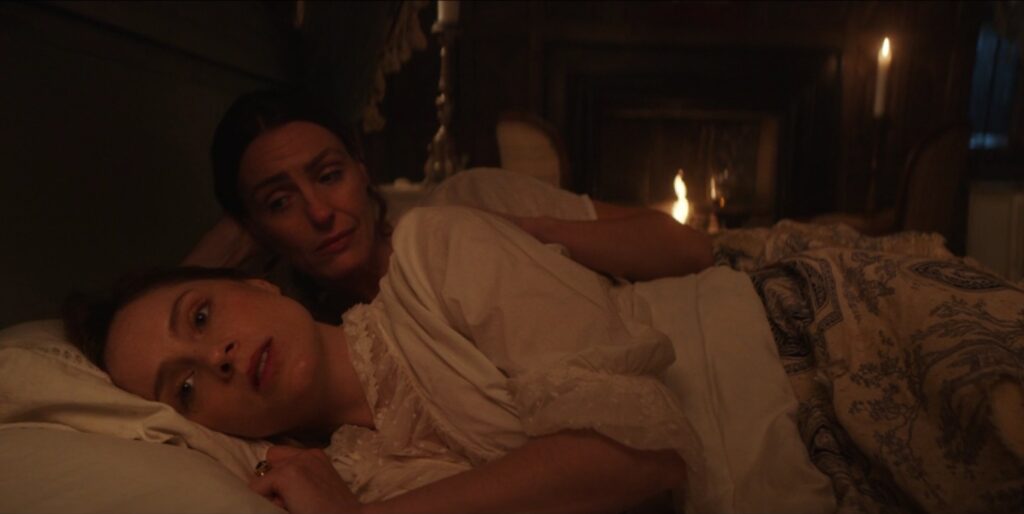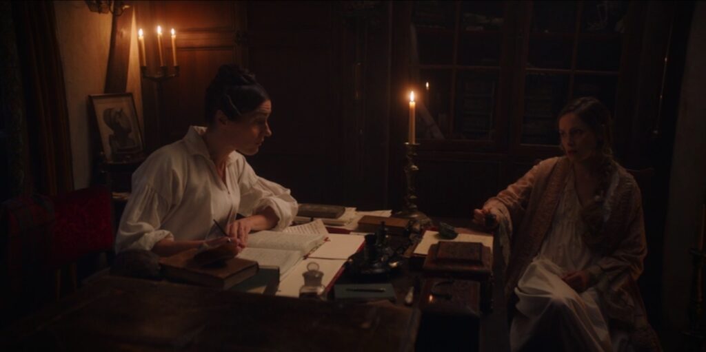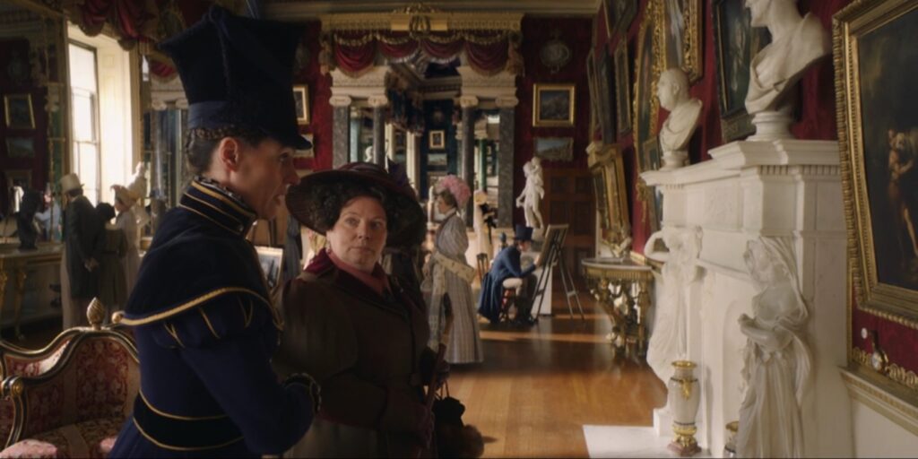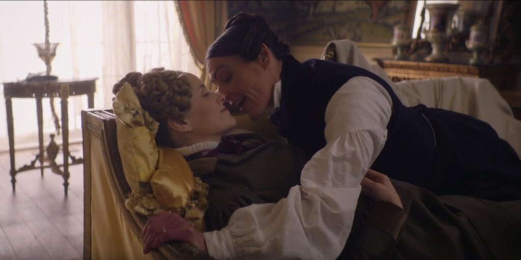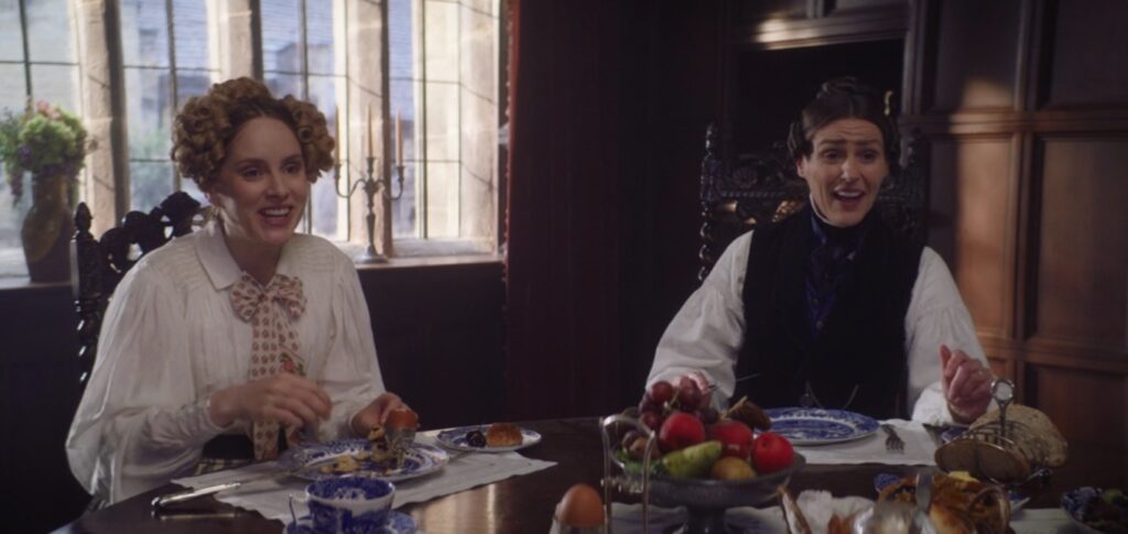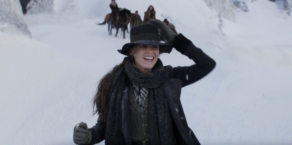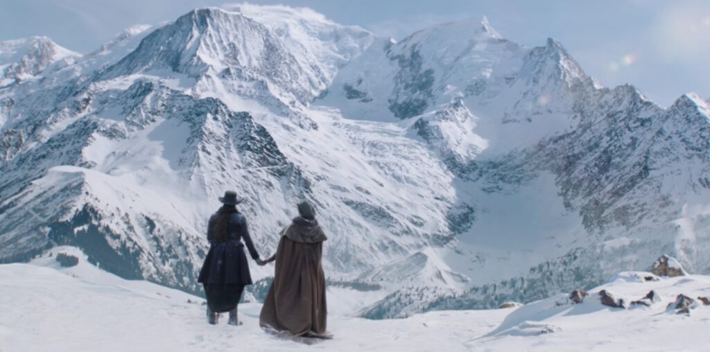 Cue une scène épique intro d’Anne Lister randonnée à travers les montagnes enneigées. Elle est suivie par leur aide et Ann conduit à cheval. Ann met pied à terre pour rejoindre Anne, surplombant la merveille absolue du paysage, serrant les mains alors qu’elles profitent de la grandiosité. Quel pur emblème du cheminement qu’elles entreprennent pour créer une vie d’épouse et d’épouse à une époque où elles sont carrément des pionnières. Ils arrivent dans une charmante maison alpine. Ann regarde avec adoration Anne, débordante de joie et de vigueur, complètement dans son élément dans une telle aventure.
