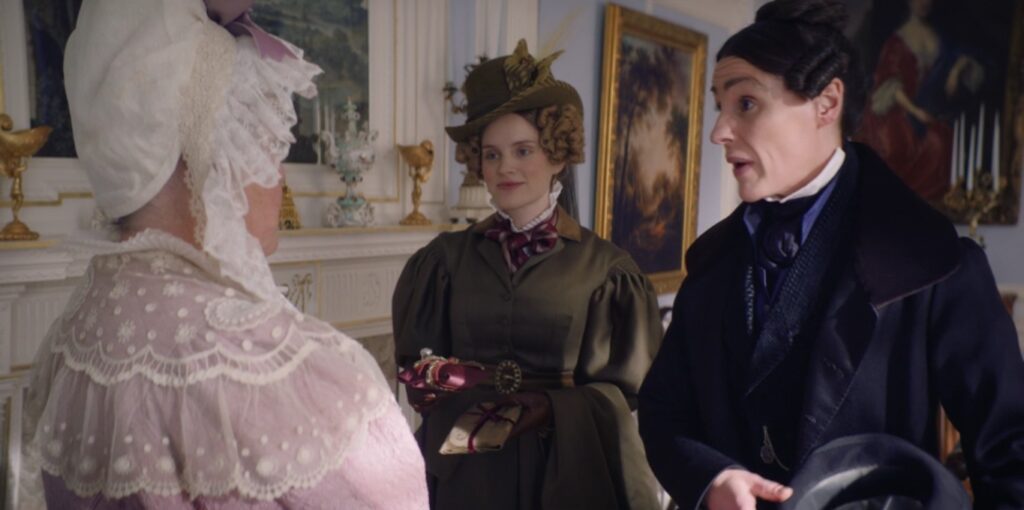 Le couple revient à Shibden après leurs voyages. J’aime à quel point la famille d’Anne est heureuse de les voir tous les deux. Anne admet, pendant le déjeuner, qu’elle a passé en contrebande deux mouchoirs en dentelle dans ses sous-vêtements à travers la frontière suisse / italienne. Elle les a achetés pour sa femme (affectueusement surnommée « Adney » maintenant), après tout, et Anne Lister n’accepte pas bien l’autorité. Anne est, comme on dit, de retour sur ses conneries, et a un dossier plein de choses à faire maintenant qu’elle est de retour à la maison.