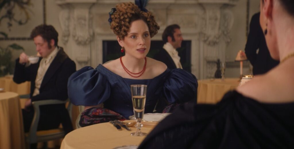 Ann et Anne sont à Paris en train de dîner dans une salle de bal chic. Je suis toujours choquée de voir Anne Lister dans une robe, avec des manches bouffantes et une coiffure idiote qui dépasse de sa tête, avec des cheveux empilés haut, mais je comprends. Elle doit parfois se camoufler si elle ne veut pas être une paria complète qui n’est pas autorisée à entrer dans les salles.