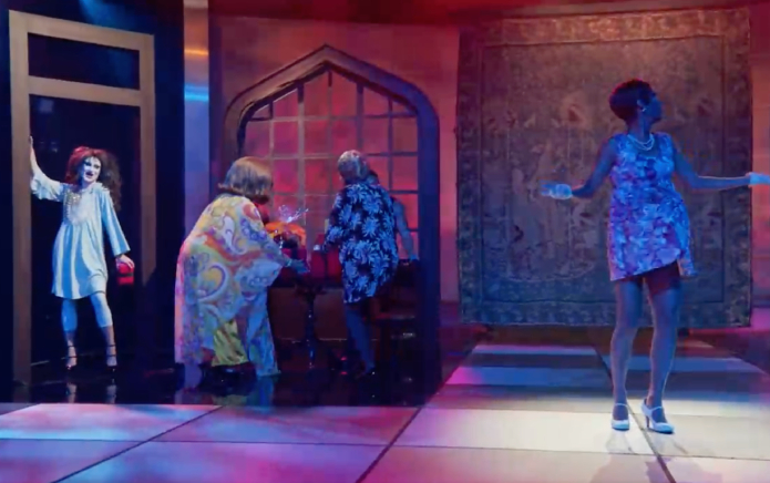 D'un côté de la salle de travail, Nina et Angeria s'extasiaient sur la performance, la première s'exclamant de son amour pour le personnage du Dr Poltergeist et du travail d'équipe collaboratif entre elle et les autres reines.