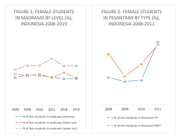 Bien qu’il y ait eu un débat sur leur qualité, les indonésiens madrasas ont atteint la parité entre les sexes dans la scolarisation. Il y a aussi plus de filles que de garçons dans le deuxième cycle du secondaire. Même l’inscription dans des internats islamiques informels ou traditionnels («pesantrens») est équilibrée entre les sexes.