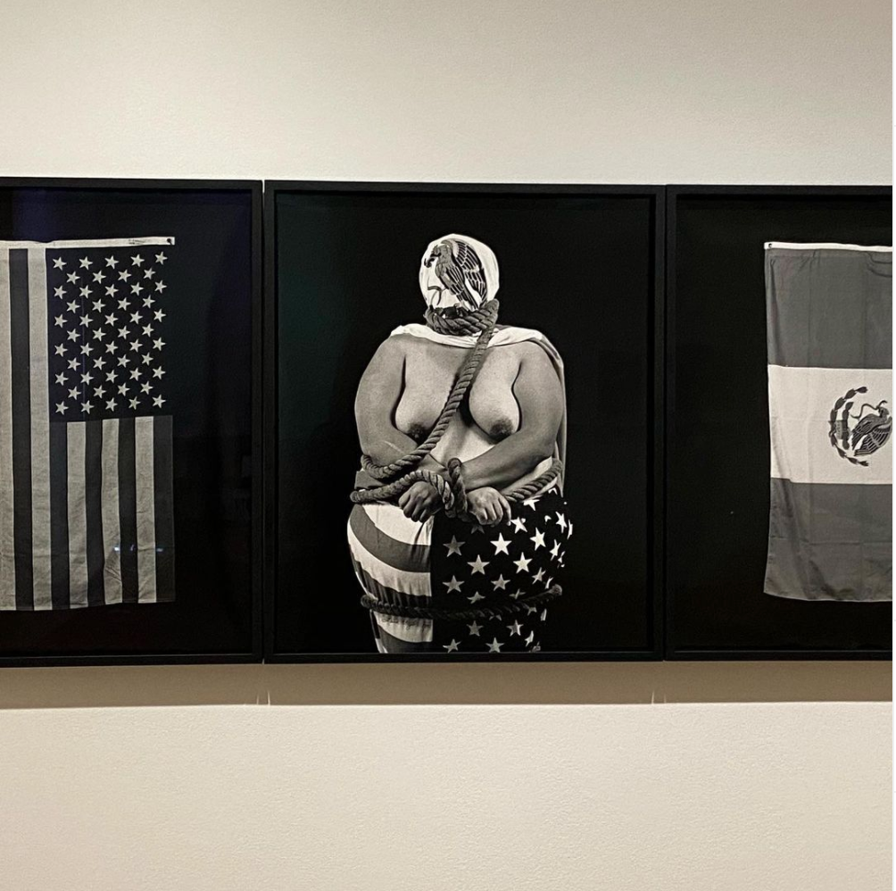 «Three Eagles Flying (1990), a préparé le terrain pour son travail futur en utilisant son corps nu comme une rébellion ouverte et courageuse contre la colonisation des identités Latinx – raciales, genrées, culturelles et sexuelles. Sa pratique a évolué intuitivement au fil du temps alors qu’elle luttait pour négocier et gérer son appartenance ethnique et sa sexualité, ses défis avec la dépression et la dyslexie auditive, et l’acceptation de son grand corps.