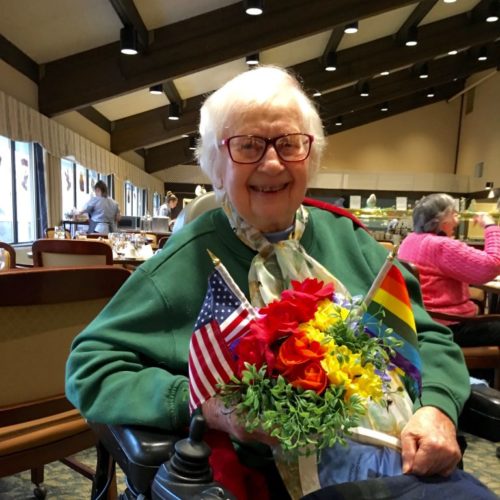 Après avoir emménagé dans un centre de vie assistée peu de temps avant la mort de Barbara des suites d’un cancer en 2007, malgré des années de chimiothérapie atroce, ils ont parlé à leurs nouveaux voisins dans le bulletin de l’établissement. Tout en dépendant d’un fauteuil roulant électrique pour se déplacer, Kay a régulièrement organisé «la table gay» dans la salle à manger qu’elle couronnait de ses propres petits drapeaux arc-en-ciel et américains et partageait avec une poignée d’autres résidents; quelque chose qui lui a profondément manqué après la pandémie de Covid-19 qui l’a forcée à prendre ses distances avec les autres et à manger dans sa chambre.