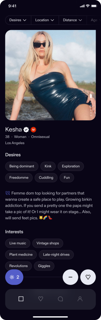 Sur l'application de rencontres Feeld, le hitmaker «garçon fou» Kesha qualifie sa sexualité de «omnisexuelle», ainsi que de noter son intérêt pour «être dominant» et «pli».