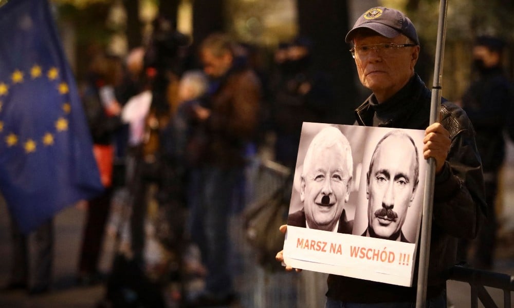 Un homme tient une pancarte avec le leader du PiS Jaroslaw Kaczynski et le président russe Vladimir Poutine lors d’une manifestation à Varsovie, en Pologne, le 7 octobre 2021 (Jaap Arriens/AFP/Getty)