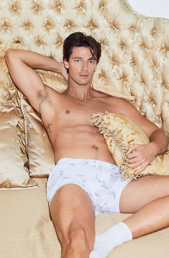 Le Acteur de la génération V Apparemment des bandes au Buff dans un troisième instantané de la campagne, qui le présente assis sur un lit en peluche tandis que son fiancé se trouve à la structure du milieu de ses jambes.