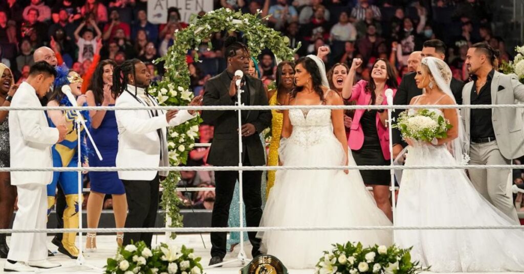 Le segment en question présentait le mariage du scénario des couples WWE à l’écran Akira Tozawa et Tamina et Reggie et Dana Brooke, point culminant d’un complot axé sur le championnat WWE 24/7. Avec R-Truth en tant qu’officiant, les couples ont joué à un jeu de chaises musicales pour ainsi dire, changeant de partenaire plusieurs fois après qu’on leur ait demandé si quelqu’un s’y était opposé.