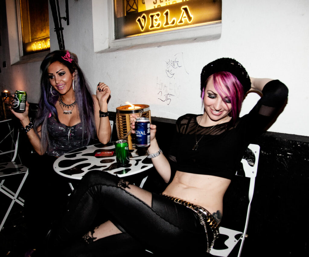 En déambulant dans les rues à la mode du quartier de Vesterbro, j’ai trouvé Vela— Le dernier bar lesbien de Copenhague. CComplètement camouflé de l’extérieur, niché dans une petite rue latérale, ce petit bar peut être difficile à repérer même avec une carte. Je suis passé deux fois devant. Déguisé par des peintures murales en vitrail de Geishas, une relique d’une époque où les lieux queer devaient cacher l’identité de leurs clients, je suis entré par la petite porte latérale.