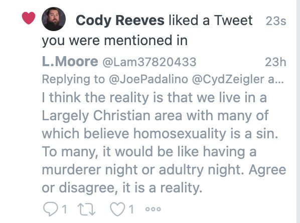 Certains des tweets anti-Pride que l’entraîneur Reeves a « aimés » ne sont pas gentils, parlant de personnes homosexuelles enfreignant les lois de la nature et de Dieu, comparant le fait d’être LGBTQ à avoir des troubles mentaux et à être des meurtriers, et utilisant un autre langage malheureux.