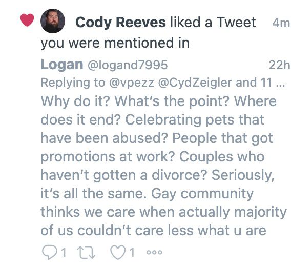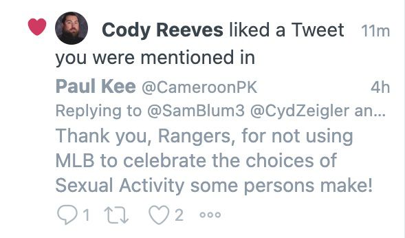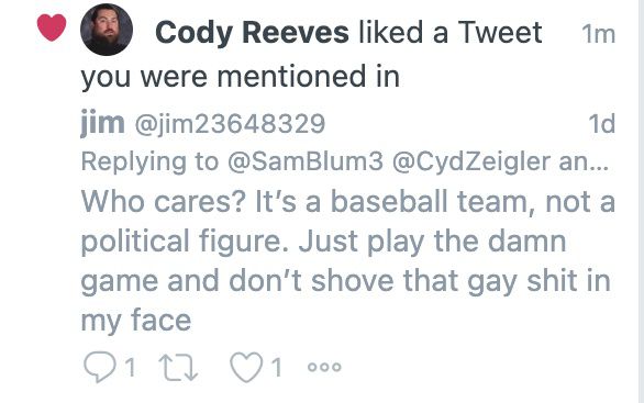 Certes, tout le monde peut donner son avis sur ce qu’il veut d’une Pride Night en MLB. Pourtant, j’ai compté les tweets à l’époque – Il y avait 57 likes de Reeves au total, tous des posts likant qui marginalisaient la communauté LGBTQ ou une célébration de la fierté.