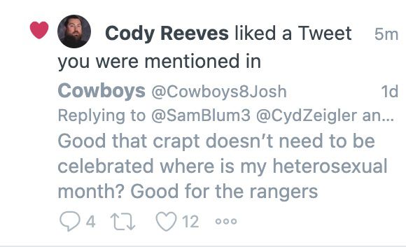 C’est peu de temps après que l’écrivain de Dallas Morning News, Sam Blum, a publié quelque chose le 31 mai sur les Texas Rangers que j’ai remarqué une multitude de tweets anti-LGBTQ.