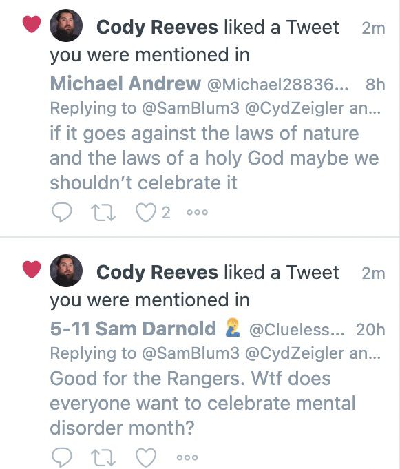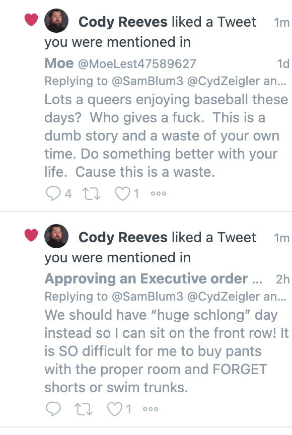 Le lendemain, sur mon flux Tweetdeck, un flot de « j’aime » destinés au public de la part d’une personne nommée Cody Reeves, qui a depuis verrouillé son compte Twitter et m’a bloqué. J’avais été tagué dans le tweet original de Blum, alors j’ai vu toutes les réponses.