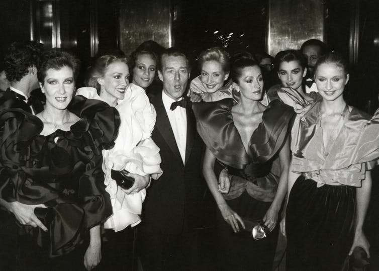 Halston avec les Halstonettes – un groupe de mannequins qui faisaient partie de son entourage – au Metropolitan Museum of Art de New York en 1980.