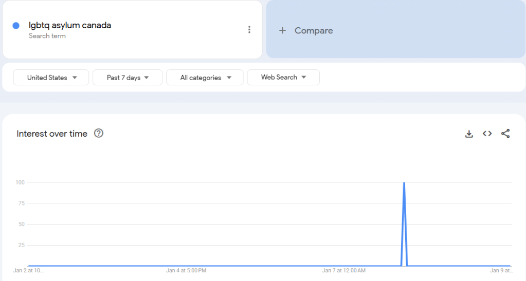 Dans ce contexte, il y a eu une augmentation des recherches Google pour le terme « LGBTQ+ asile Canada », semblable à une augmentation antérieure en 2025 qui a commencé à apparaître le 20 janvier : le jour de l'investiture de Trump.