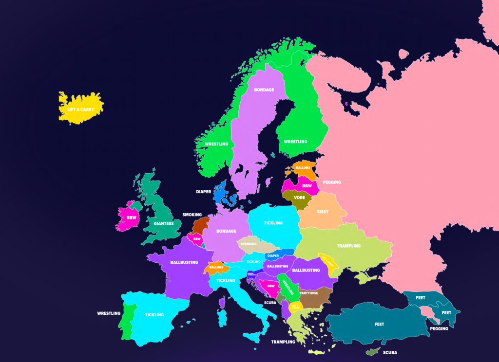 Après que la liste de PornHub des termes les plus recherchés en 2023 se soit révélée révélatrice l'année dernière, la plateforme Kink et fétichiste Clips4Sale a créé une carte de l'Europe basée sur les fétiches les plus populaires du continent, avec des coups de couilles, de lutte et de chatouilles.