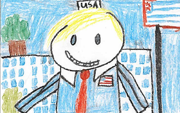Un garçon de troisième année a dessiné une image de Donald Trump. « Il prononce un discours disant que nous devrions enfermer Hillry Clinton », a-t-il écrit. Nous avons demandé : à votre avis, quel genre de choses le leader fait-il au cours d’une journée typique ? « Allez aux infos, allez au cort. » Qu’a-t-il pensé du leader : « Un cul de poule. »