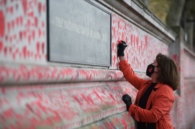 Le mémorial de Londres est peut-être le plus connu à ce jour. Situé à Westminster, le National Covid Memorial Wall est une fresque publique composée de cœurs rouges et s’étendant sur plusieurs centaines de mètres le long des rives de la Tamise.