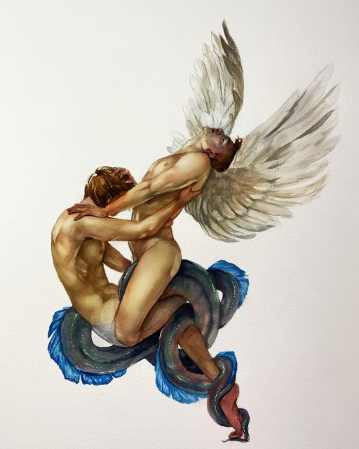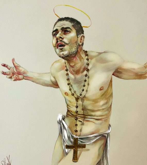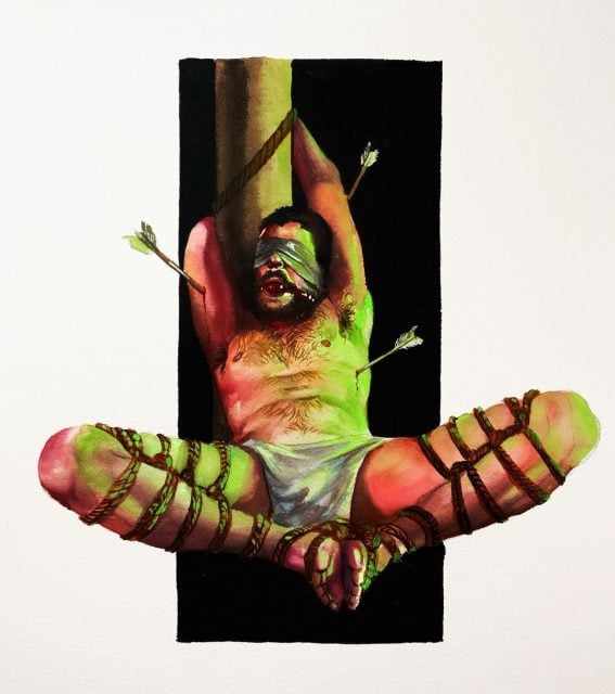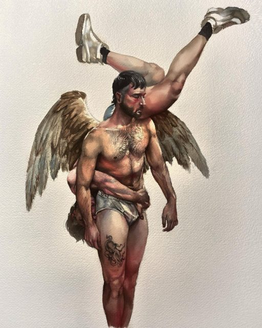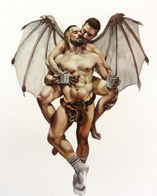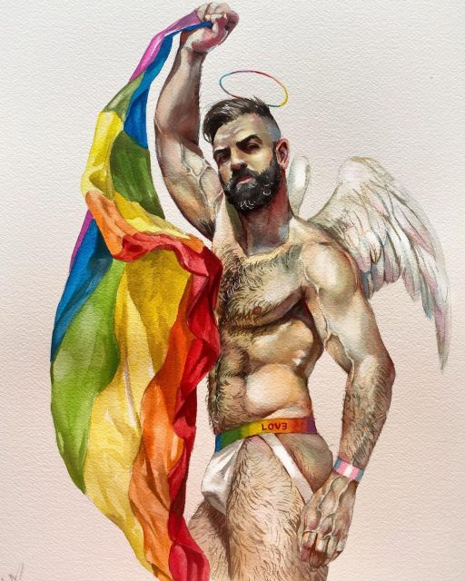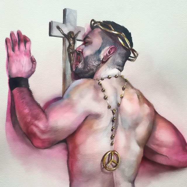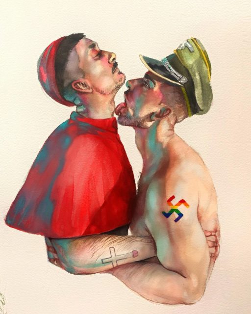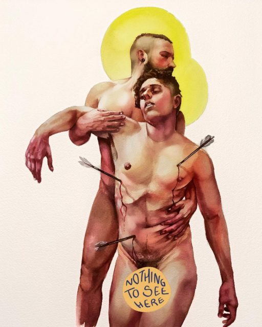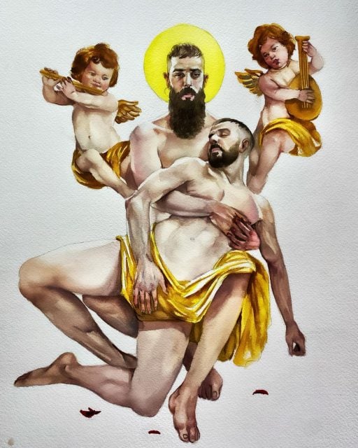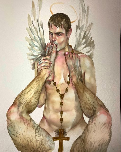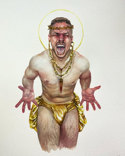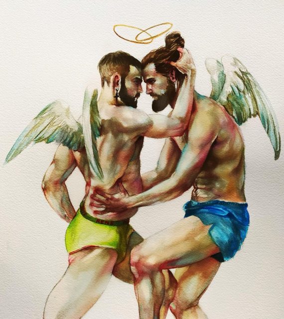 Vivant actuellement à Barcelone, René Farias travaille principalement l’aquarelle, l’huile et le graphite. Avec des influences comme Caravaggio, Bouguereau, Banksy, Norman Rockwell et Tom of Finland, Farias a une vision qui se sent pleinement réalisée. Son travail est chargé de symbolisme religieux gay, ce qui lui a valu de nombreuses critiques, en particulier de la part de la communauté catholique. En tant qu’artiste queer, Farias doit également faire face régulièrement à l’homophobie. En tant qu’artiste qui explore fréquemment les tabous et les stéréotypes, c’est quelque chose que Farias semble prendre dans sa foulée. Bien qu’il ait plus de liberté pour explorer son sujet que beaucoup de ses idoles, Farias n’a pas exactement le champ libre. « Ma plus grande plate-forme de visualisation est Instagram et Facebook », déclare Farias. « Plusieurs fois, j’ai des idées que je dois modifier pour que ces plateformes me permettent d’exposer mon travail sans le censurer ni fermer mon compte. »