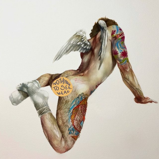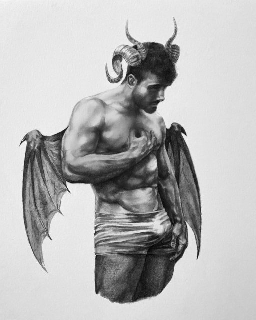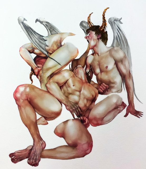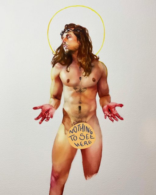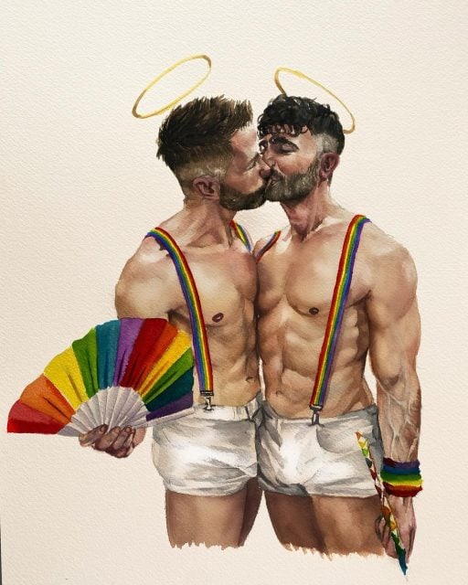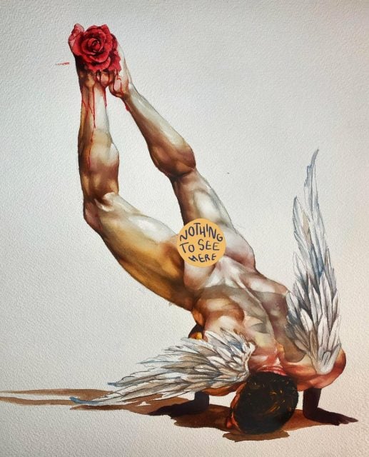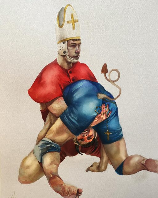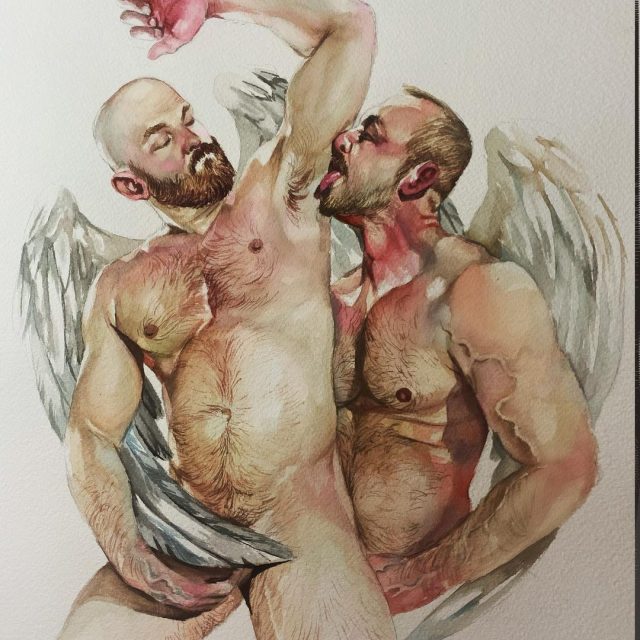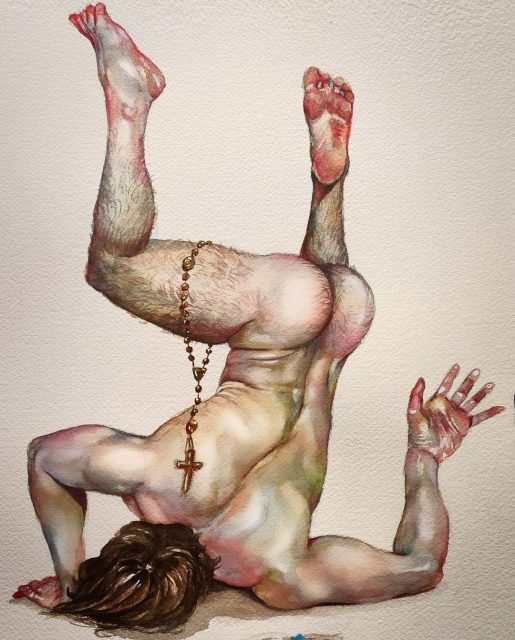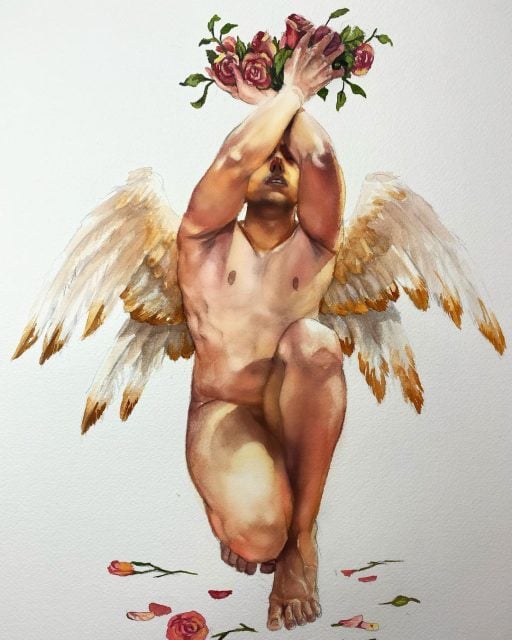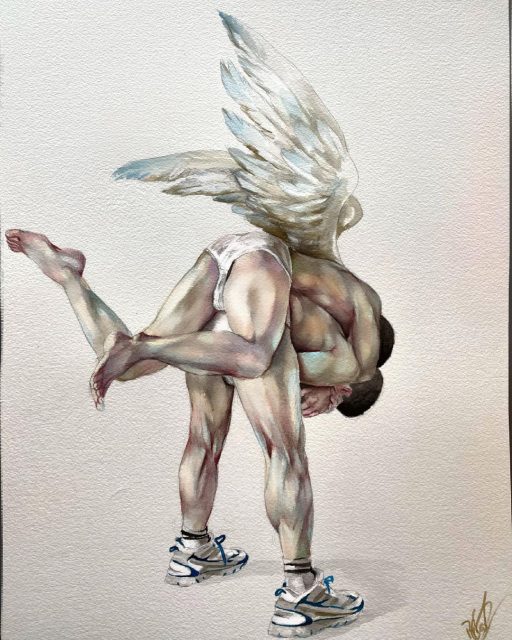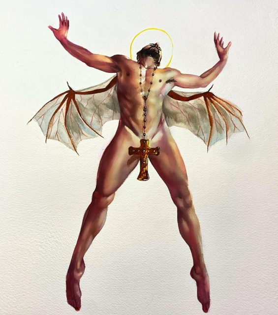 Vivant actuellement à Barcelone, René Farias travaille principalement l’aquarelle, l’huile et le graphite. Avec des influences comme Caravaggio, Bouguereau, Banksy, Norman Rockwell et Tom of Finland, Farias a une vision qui se sent pleinement réalisée. Son travail est chargé de symbolisme religieux gay, ce qui lui a valu de nombreuses critiques, en particulier de la part de la communauté catholique. En tant qu’artiste queer, Farias doit également faire face régulièrement à l’homophobie. En tant qu’artiste qui explore fréquemment les tabous et les stéréotypes, c’est quelque chose que Farias semble prendre dans sa foulée. Bien qu’il ait plus de liberté pour explorer son sujet que beaucoup de ses idoles, Farias n’a pas exactement le champ libre. « Ma plus grande plate-forme de visualisation est Instagram et Facebook », déclare Farias. « Plusieurs fois, j’ai des idées que je dois modifier pour que ces plateformes me permettent d’exposer mon travail sans le censurer ni fermer mon compte. »