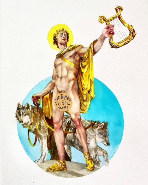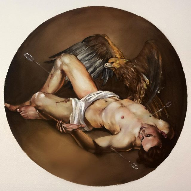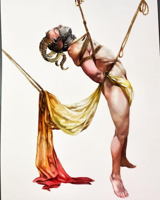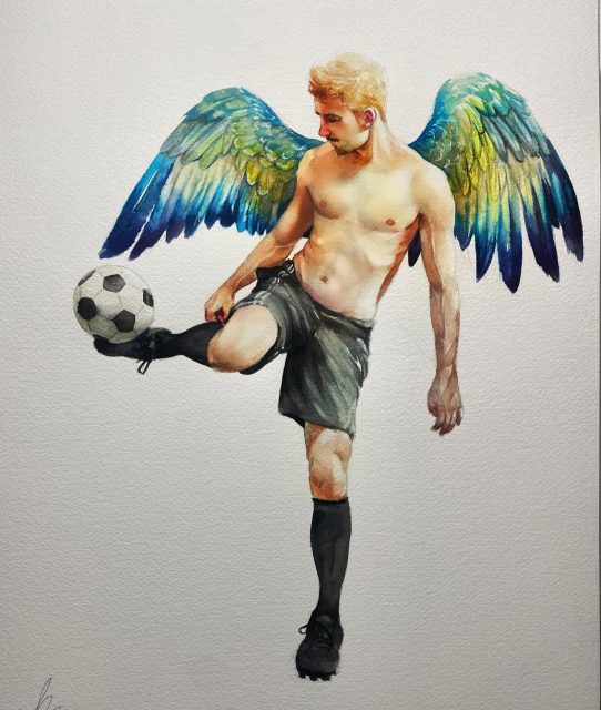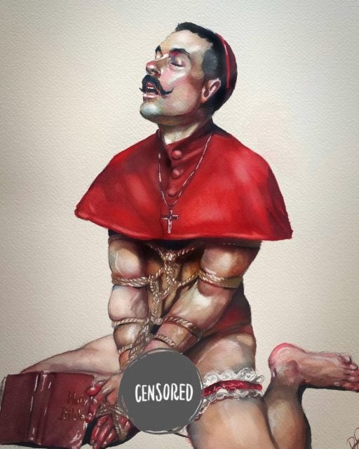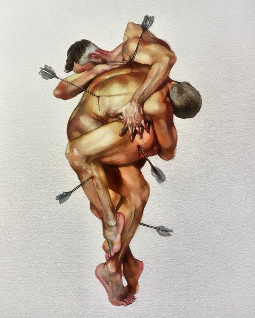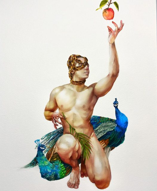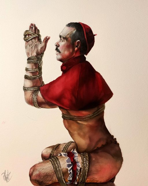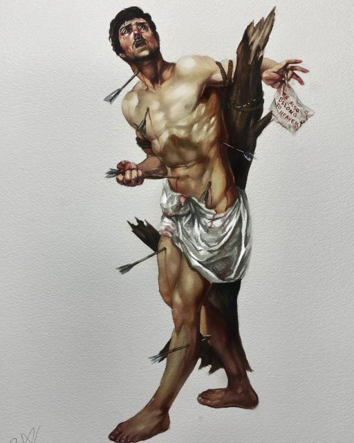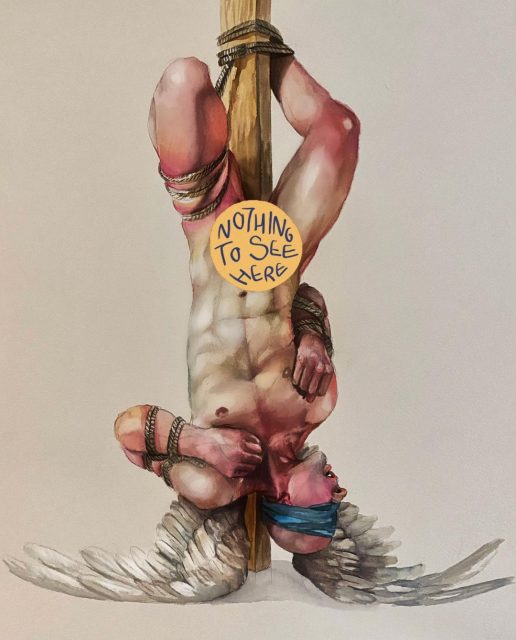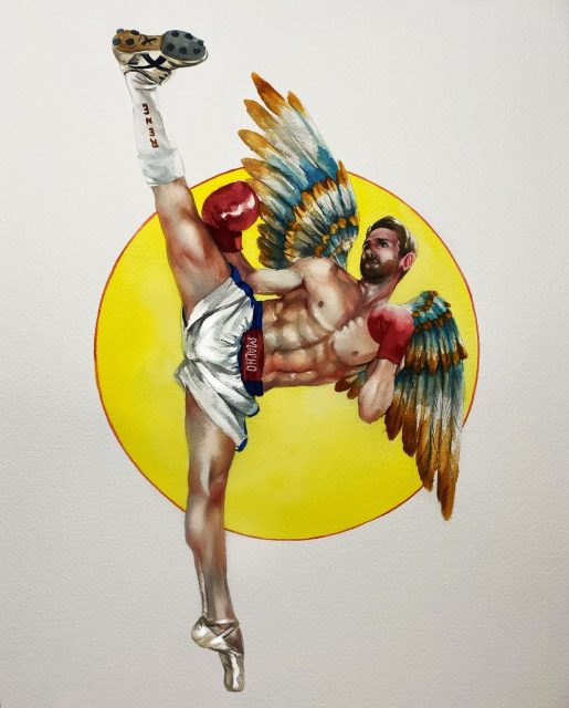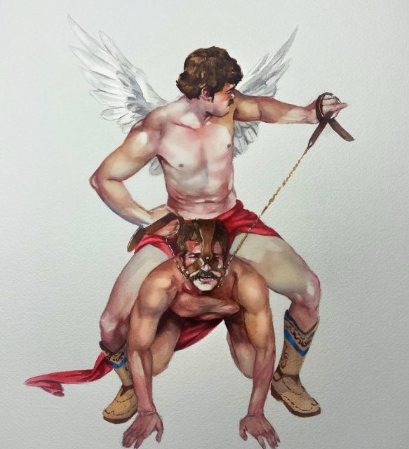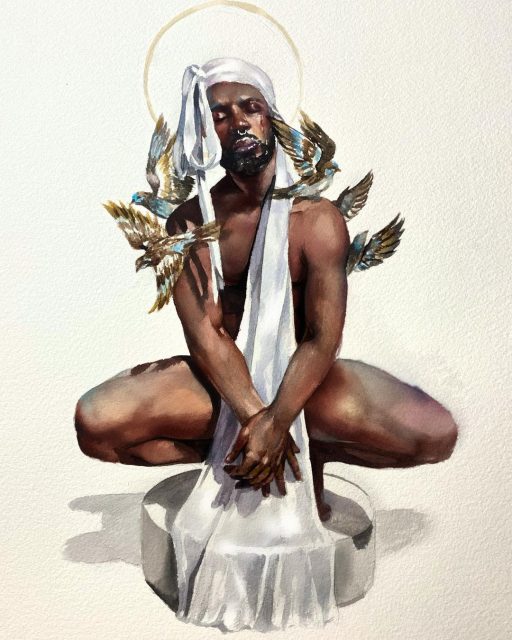 Vivant actuellement à Barcelone, René Farias travaille principalement l’aquarelle, l’huile et le graphite. Avec des influences comme Caravaggio, Bouguereau, Banksy, Norman Rockwell et Tom of Finland, Farias a une vision qui se sent pleinement réalisée. Son travail est chargé de symbolisme religieux gay, ce qui lui a valu de nombreuses critiques, en particulier de la part de la communauté catholique. En tant qu’artiste queer, Farias doit également faire face régulièrement à l’homophobie. En tant qu’artiste qui explore fréquemment les tabous et les stéréotypes, c’est quelque chose que Farias semble prendre dans sa foulée. Bien qu’il ait plus de liberté pour explorer son sujet que beaucoup de ses idoles, Farias n’a pas exactement le champ libre. « Ma plus grande plate-forme de visualisation est Instagram et Facebook », déclare Farias. « Plusieurs fois, j’ai des idées que je dois modifier pour que ces plateformes me permettent d’exposer mon travail sans le censurer ni fermer mon compte. »