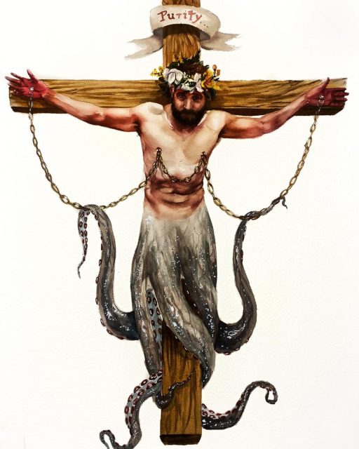 Aussi étonnant que cela puisse paraître, ce n’était qu’un échantillon du travail de Farias. Il ne se contente pas non plus de créer des images religieuses homosexuelles. Un rapide coup d’œil à son catalogue et vous verrez des images récurrentes de la nature et de la mythologie. Sirènes, minotaures, fées, serpents et papillons sont les piliers de son art, chaque interprétation d’une couche complexe d’influences. Nous vous recommandons fortement d’acheter une pièce pour vous-même ou au moins de suivre Rene Farias sur Instagram.
