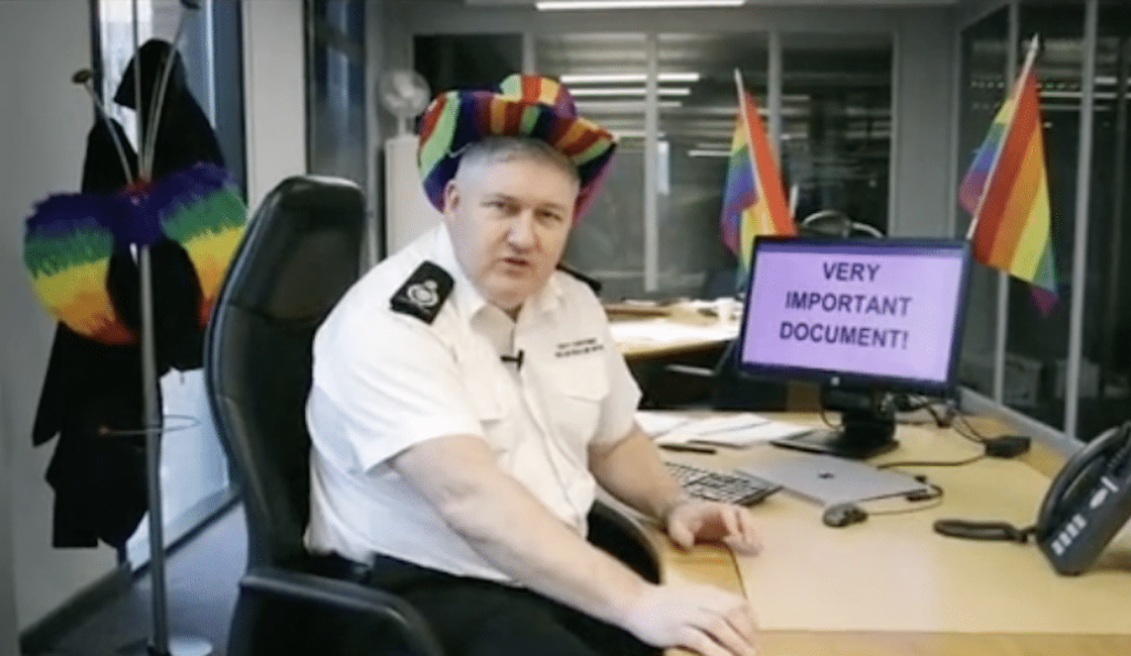 Un poste d’employé derrière un bureau, des drapeaux arc-en-ciel sortant de son uniforme, comme il dit : « Je ne sais pas pourquoi vous ressentez le besoin de célébrer. » Cue les confettis et les poppers de fête.