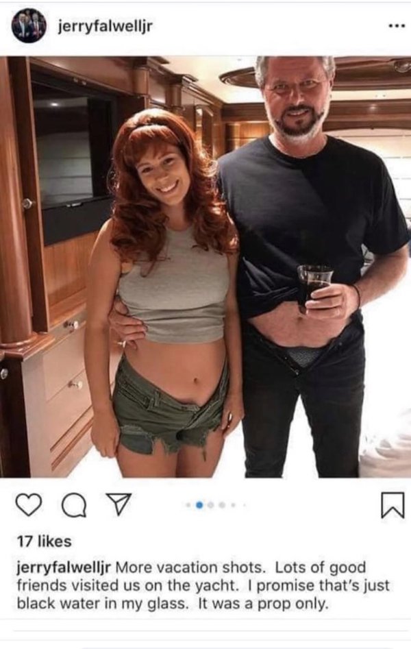 La photo supprimée depuis montrait Falwell Jr., l'un des principaux partisans évangéliques du président Donald Trump, avec son pantalon décompressé et ses sous-vêtements à l'affiche, aux côtés d'une femme qu'il prétend être l'assistante de son épouse. Le pantalon de la femme a également été dézippé et Falwell Jr. tenait un verre contenant un liquide sombre, qui, selon lui, dans la légende était "juste de l'eau noire".