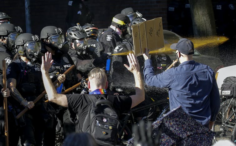 Des policiers de Seattle déploient du gaz poivré alors qu’ils affrontent des manifestants à Seattle, Washington, le 25 juillet 2020.