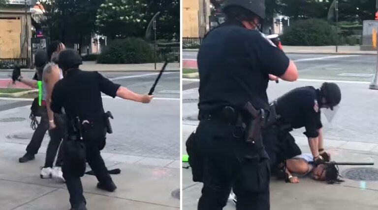 Ensuite, plusieurs bruits sourds se font entendre et de la fumée apparaît autour de la femme, indiquant que des boules de poivre ont été tirées. Deux policiers l'ont ensuite frappée à plusieurs reprises avec des matraques jusqu'à ce qu'elle tombe par terre.