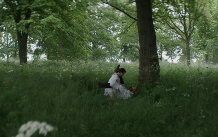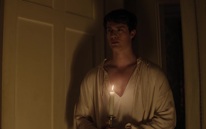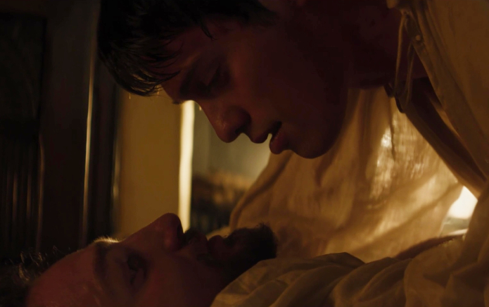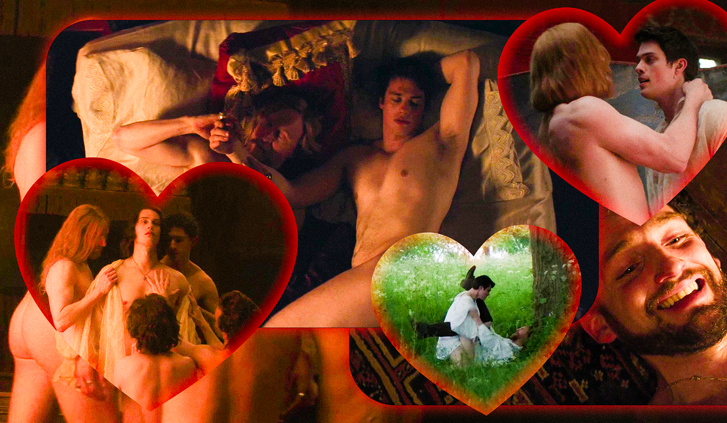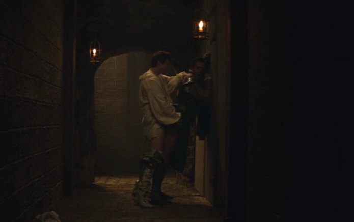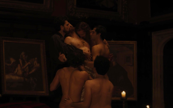 Dans la première, George est obligé par sa mère de voyager en France, où il est coaché par le noble français Jean (Khalil Gharbia) pour apprendre « les voies du raffinement » et comment être un « gentleman » via l'escrime, la danse et autres. des compétences dites « masculines » jugées précieuses à l’époque jacobéenne. Un soir, après un temps indéterminé dans sa formation, George s'approche de la porte de la chambre de Jean pour l'informer qu'il est « prêt à être vu en société », pour ensuite rencontrer Jean légèrement vêtu et son amant nu. Après que Jean remarque qu'il a surpris George en train de regarder d'autres hommes, le duo lui fait signe de les rejoindre pour une séance de baise. Bien que le personnage de Galitzine hésite au début, il se déshabille bientôt et les rejoint pour l'action, qui – Désolé pour cela – se déroule hors écran. C'est une scène plutôt apprivoisée par rapport aux autres scènes de cette liste, mais le niveau d'érotisme… élevé, très haut.