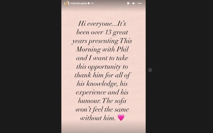 « Cela fait plus de 13 belles années que je présente This Morning with Phil, et je veux profiter de cette occasion pour le remercier pour toutes ses connaissances, son expérience et son humour », a-t-elle écrit sur sa story Instagram. « Le canapé ne sera pas le même sans lui. »