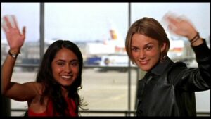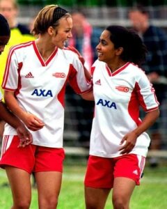 Pourtant, malgré ces défauts, on a du mal à imaginer un film comme Joue la comme Beckham se fait aujourd’hui. Ce film célèbre l’athlétisme féminin. Il montre des femmes en train de transpirer, des femmes dans des vestiaires, sans jamais satisfaire le regard masculin. J’entends par là que chaque femme est présentée comme une athlète, jamais réduite à un objet sexuel à travers l’objectif de la caméra. Pendant la majeure partie du film, Jess et Jules portent des vêtements amples et androgynes et pratiquement pas de maquillage. Lorsqu’ils s’entraînent ou jouent un match, ces personnages transpirent.
