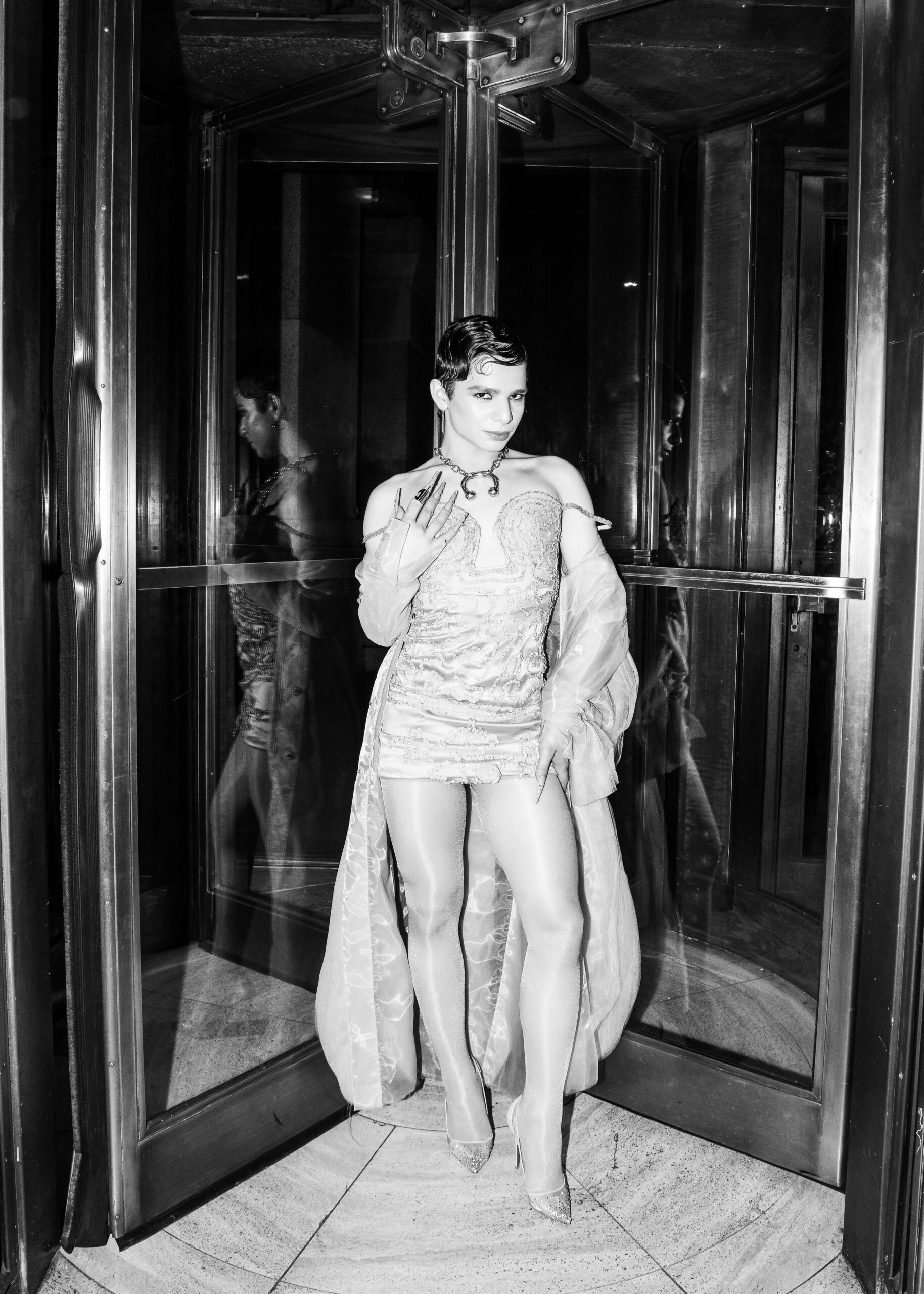 «C'est tellement surréaliste», dit-elle à propos de sa vie à ce moment-là. Issue de la scène ballroom, dont elle fait partie depuis 2019, les maisons empruntent souvent leurs noms à des ateliers renommés, mais Honey travaille désormais avec la mode à titre officiel. « J'utilise tout ce que j'ai en moi pour arriver là où je veux être. »