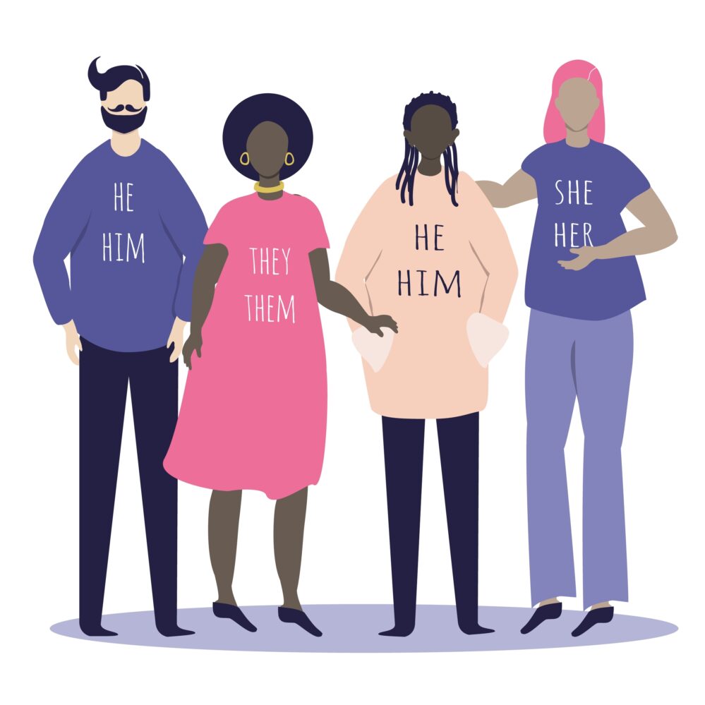 Aussi appelés « pronoms de genre préférés » ou « pronoms personnels », les pronoms de genre sont des mots que nous substituons à nos propres noms et à ceux d’autres personnes. Les exemples incluent « il / lui / son », « elle / elle / elle » et « ils / eux / leurs », ce dernier étant souvent utilisé par des personnes non binaires.