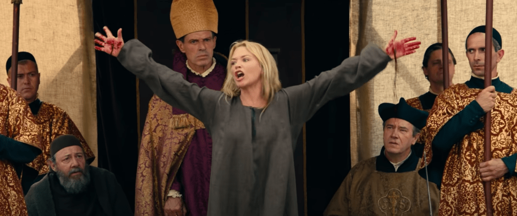 Puis c’est la fin. L’ex-religieuse en chef – remplacée par Benedetta lorsque les gens pensent qu’elle est miraculeuse – espionne Benedetta et Bartolomea tout en ayant des relations sexuelles avec un gode sculpté à la main fabriqué à partir d’un mini que Mary Benedetta avait dans son enfance, et se rend à Florence pour le dire au représentant du Pape .