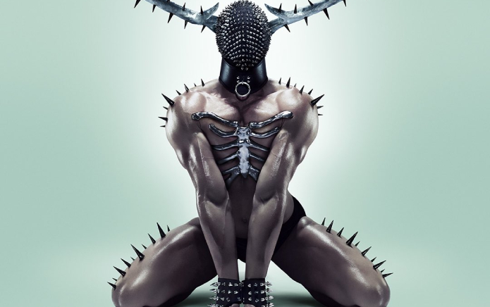 Une photo montre un homme portant un masque clouté inspiré du BDSM avec deux grands bois pointus poussant sur le côté.