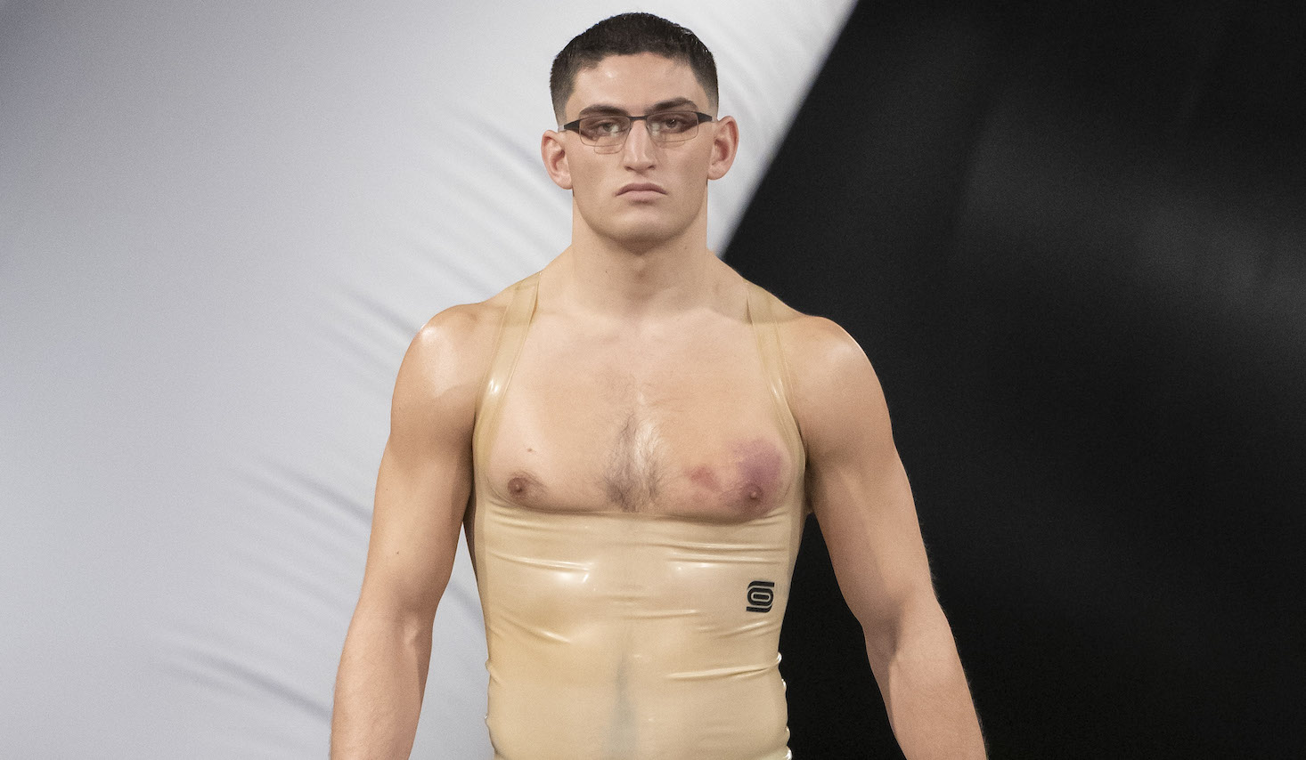 C’est vrai; l’ambiance « corporate girly » est terminée. Place plutôt à l’anti-workwear d’Olly Shinder. Pour sa deuxième sortie Fashion East, le créateur a développé sa fascination actuelle pour les uniformes contemporains. Entretenant son intérêt pour l’athleisure et le sportswear, il a également fait une incursion dans le monde apparemment opposé des entreprises et du kink : mariant des cols de chemise sculpturaux, des lunettes et des pantalons skinny avec des cuissardes en cuir, des accents en caoutchouc élégants et des bustiers prêts pour le Berghain.